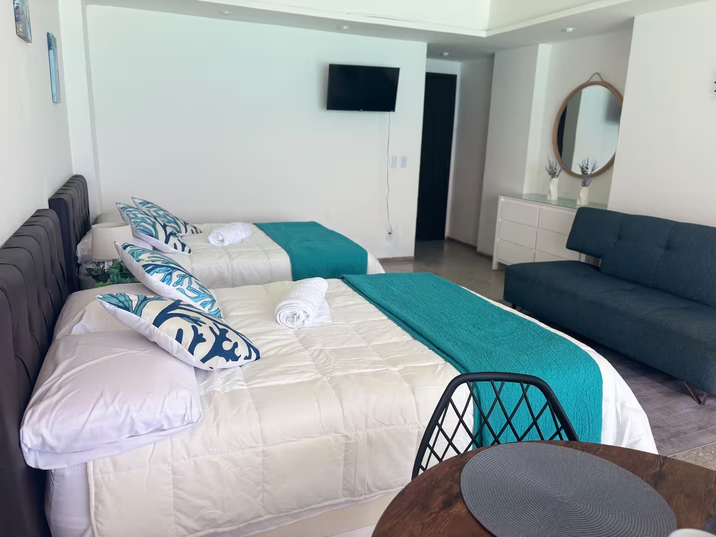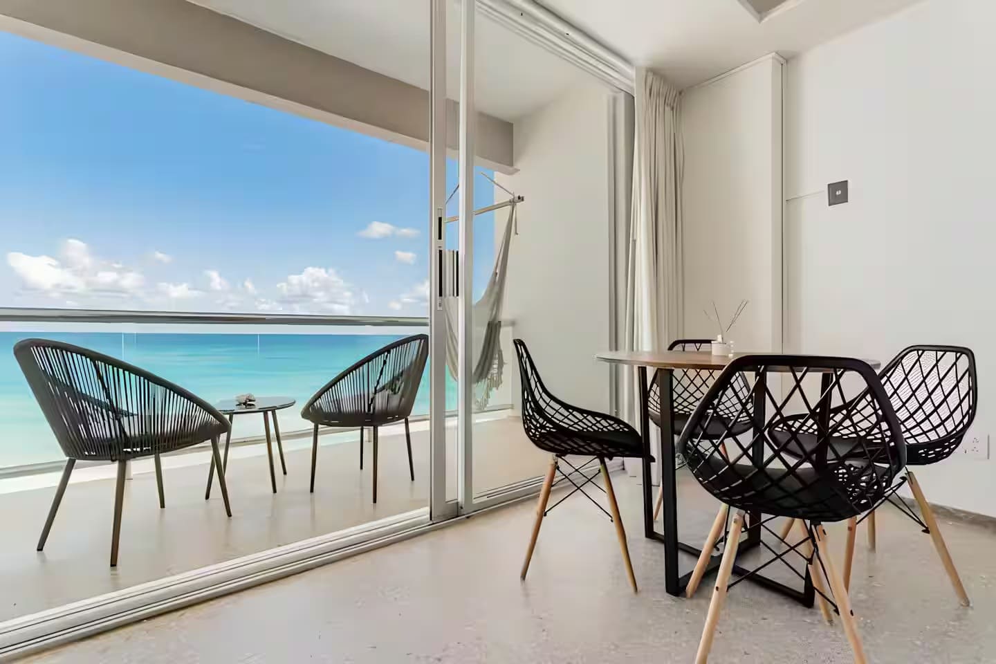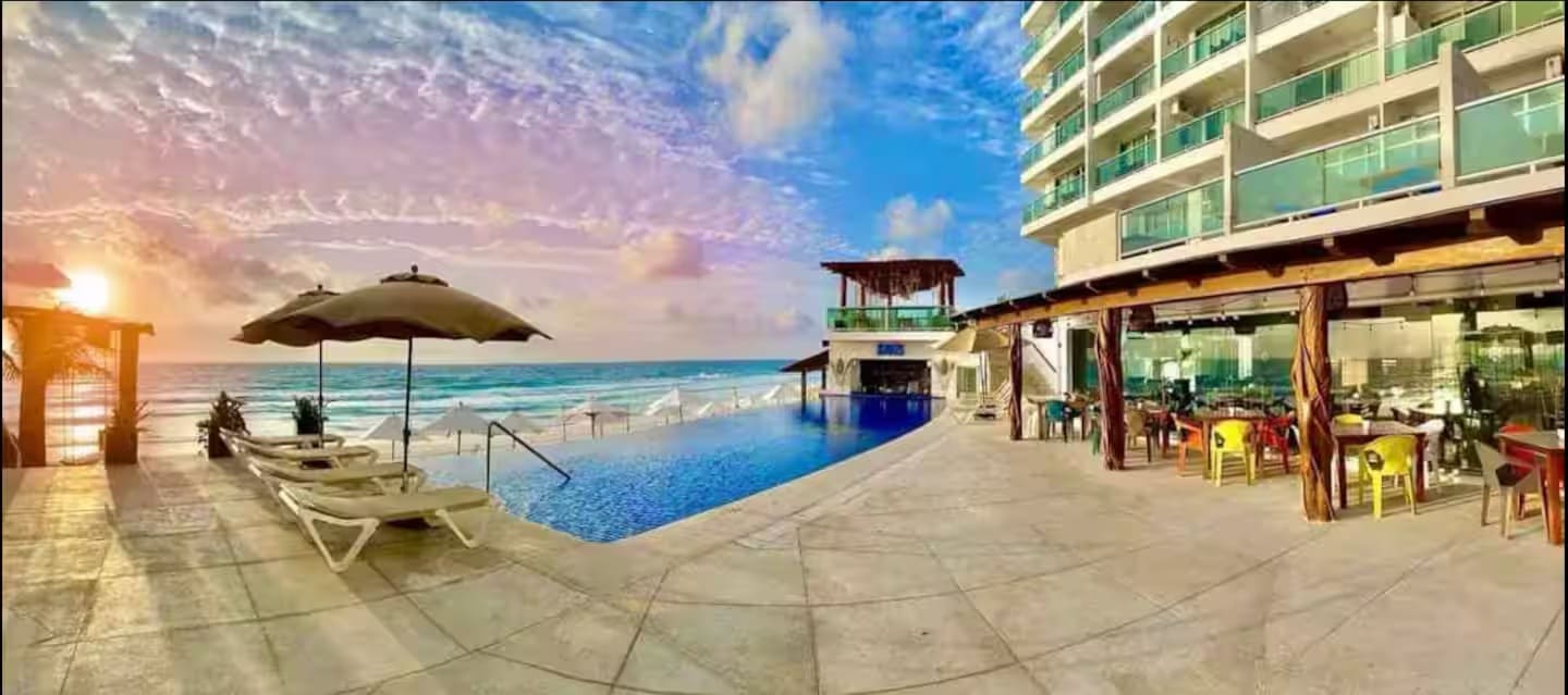 Our accommodation has two double beds and a sofa bed, a bathroom with everything you need for your stay, a basic kitchenette, a table and chairs, as well as a magnificent terrace with its respective furniture to enjoy the incredible views you will have of the incredible sunrises. The Ocean Dream complex has two pools at sea level, and one of them has a jacuzzi. As well as living areas, hammocks, and access to the beach and the beautiful Caribbean sea.