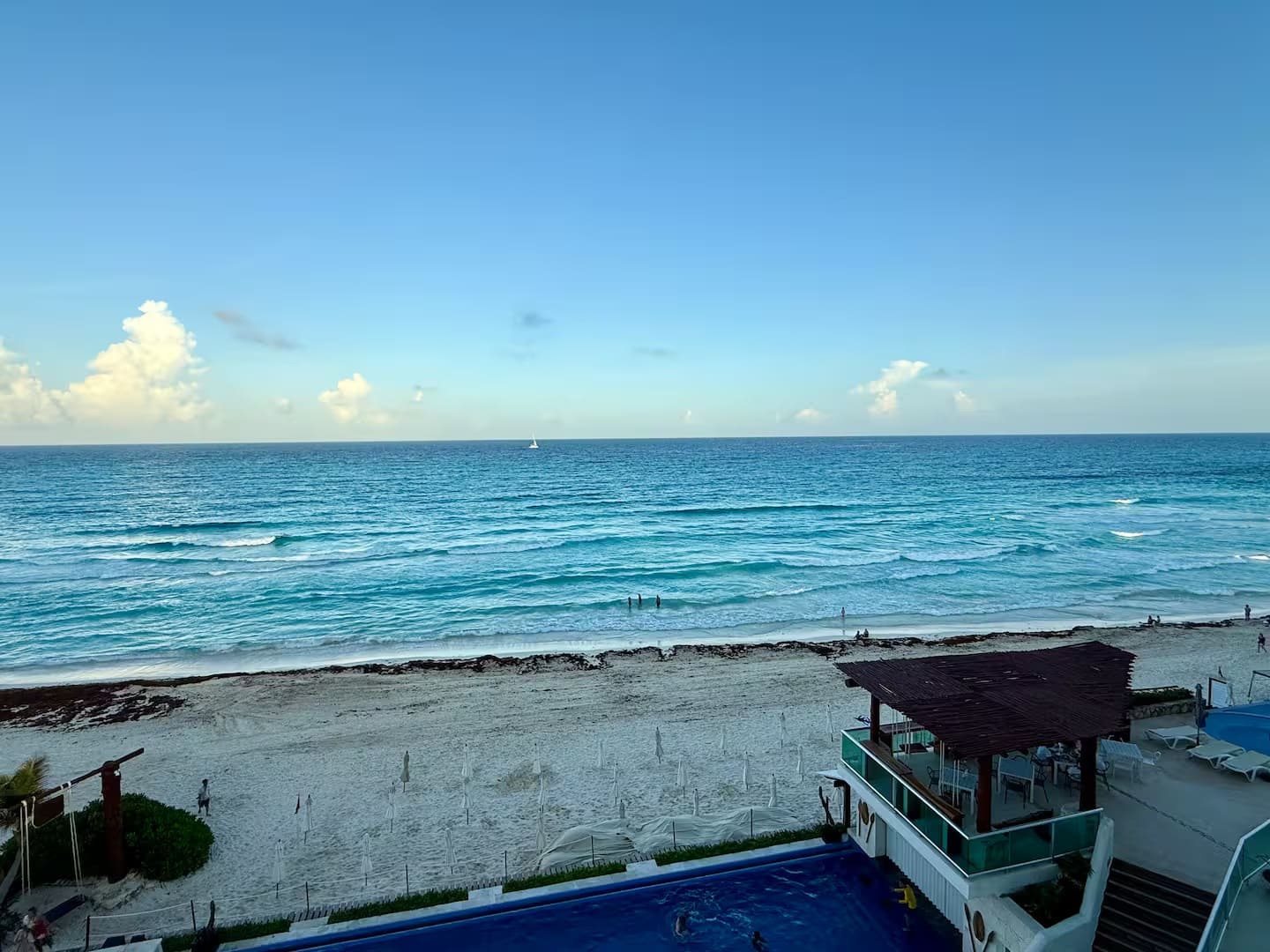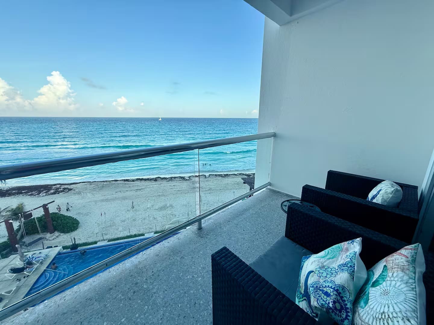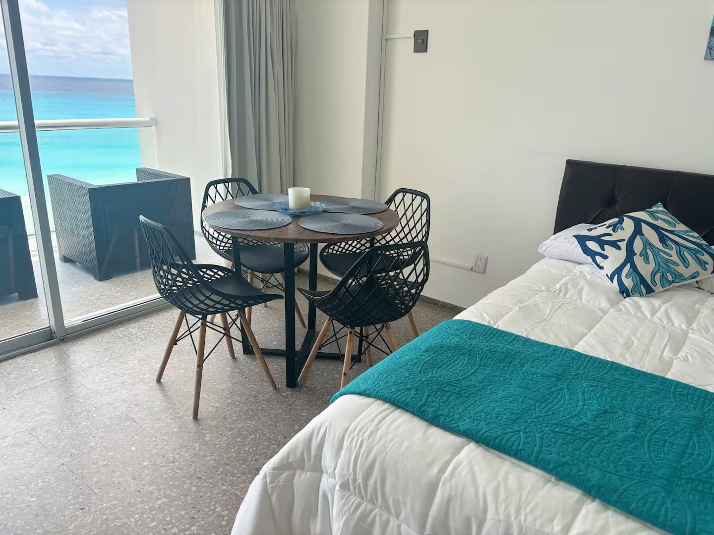 Our accommodation has two double beds and a sofa bed, a bathroom with everything you need for your stay, a basic kitchenette, a table and chairs, as well as a magnificent terrace with its respective furniture to enjoy the incredible views you will have of the incredible sunrises. The Ocean Dream complex has two pools at sea level, and one of them has a jacuzzi. As well as living areas, hammocks, and access to the beach and the beautiful Caribbean sea.